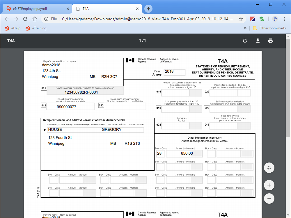 You can also review the T4A as a PDF file that can be downloaded, printed, or emailed to the employee.