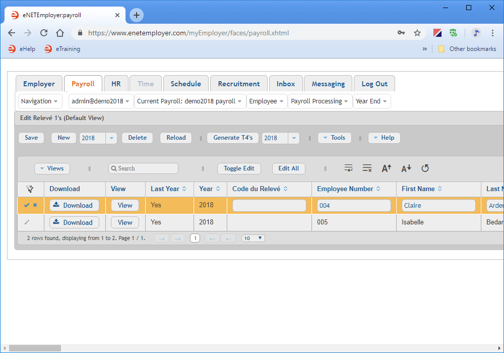 - From the Payroll tab, open the Year End - Edit Relevé 1's screen where you can view and edit each employee's RL-1 data.